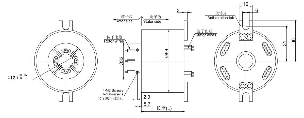 ● HT1256是標準系列過孔滑環(huán)(高速過孔滑環(huán)),,過孔直徑12.7mm(適用任何<=12.7mm),外徑為56mm精密導電滑環(huán)。
